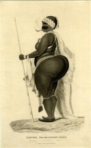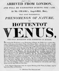 কিন্তু এর বাইরেও বর্ণবৈষম্যের নগ্নতম চেহারা হিসবে দুটি উদাহরণ দেওয়া যেতে পারে। এখানে অনেকেরই স্মরণে আসতে পারে ১৮১০ সালে আফ্রিকা থেকে এক নারীকে ধরে আনা হয়েছিল। নাম দেওয়া হয়েছিল Hottentot Venus। সাদা, “উন্নত” সভ্যতার ব্রিটিশ তথা ইউরোপীয়দের “অপর” হিসবে অতি-ভারী নিতম্বের ঘোর কৃষ্ণবর্ণ এই নারীকে উলঙ্গ অবস্থায় খাঁচা-বন্দী করে লন্ডনের বিভিন্ন জায়গায় (এবং পরে প্যারিসে) প্রদর্শিতও করা হয়েছিল। লন্ডনের নামী সংবাদপত্রে এর বিজ্ঞাপনণও দেওয়া হয়েছিল। মাত্র ১ শিলিং খরচ করলেই একে দেখা যাবে – এ আশ্বাস বিজ্ঞাপিত হয়েছিল। নীচের ছবি আমার বক্তব্য পরিষ্কার করবে।