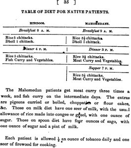 মেডিক্যাল কলেজে ক্লাসের অভ্যন্তরে বভিন্ন জাতের ছাত্ররা সমান সুযোগ পেয়ে মেডিসিনের শিক্ষা লাভ করত। অথচ Rules and Regulations of the Bengal Medical College-এ বলা হল – ভারতীয়দের খাদ্যের জন্য দৈনিক বরাদ্দ ১ আনা, অথচ ইউরোপীয়দের জন্য সে বরাদ্দ ৪ আনা (পৃঃ ৩৩-৩৫)। অর্থাৎ ভারতীয় এবং ইউরোপীয় রোগীদের প্রসঙ্গ যখন এল তখন প্রকট হয়ে উঠল বর্ণবৈষম্য। একদিকে শিক্ষার ক্লাসঘরে জাত মুছে গিয়ে নতুন ধরনের সেক্যুলারিটির জন্ম হল; অন্যদিকে প্রশাসনের মাঝে দৃঢ়ভাবে প্রোথিত হয়ে রইল race-এর অনপনেয় ধারণা – যার একটি উদাহরণ ভারতীয় এবং ইউরোপীয় দৈনিক খাদ্যের বরাদ্দের মাঝে সুবিপুল ও প্রকট পার্থক্য।