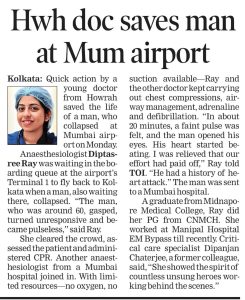 মুম্বই বিমানবন্দরের ব্যস্ত টার্মিনাল। চারদিকের হইচইয়ের মধ্যে হঠাৎই মাটিতে লুটিয়ে পড়লেন প্রায় ৬০ বছর বয়সী এক যাত্রী। শ্বাস বন্ধ, নাড়ির স্পন্দন নেই। আতঙ্কে ছড়িয়ে পড়ল ভিড়। ঠিক তখনই সামনে এগিয়ে এলেন হাওড়ার এক তরুণী চিকিৎসক, অ্যানেস্থেসিওলজিস্ট দীপ্তশ্রী রায়।