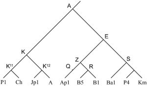 (A hypothetical stemma of Carakasaṃhitā Vimānasthāna 8 for ten genealogically decisive manuscripts)[36]