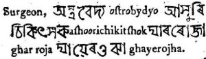 ১ম খণ্ডে Surgeon-এর বাংলা প্রতিশব্দ হিসেবে আছে অস্ত্রবৈদ্য, আসুরিচিকিৎসক, ঘার রোজা, ঘায়েরওঝা – । ২য় খণ্ডে অস্ত্রবৈদ্য অর্থে surgeon-এর ব্যবহার করা হয়েছে – ।