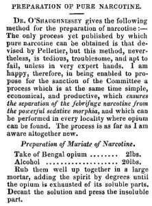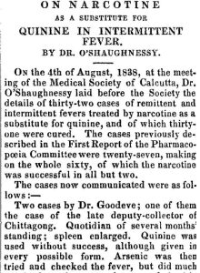 In 1839, the import of Peruvian bark (source of quinine) was stopped by Peru governmemt. To alleviate sufferings of millions of poor Indian people he discovered a new substitute “narcotine” (muriate of opium), the report of which was published in Lancet.[22] Besides narcotine’s use in intermittent fever or malaria, an American journal reported, narcotine was also used in ague – “Dr. O’Shaughnessy added that, besides the sixty cases now recorded, more than 100 ague patients had been treated by his pupils and acquaintance with perfect success by this remedy.”[23] It was later renamed “anorcotine”.[24] According to Lancet, “It is generally known, that one of the crystalline constituents of opium received from chemists the name of “narcotine,” under an erroneous impression that it was the narcotic principle of that drug.”[25] Lancet added, “it is very properly proposed to prefix the privative letter a to the name, and henceforth designate it as anarcotine.”[26]